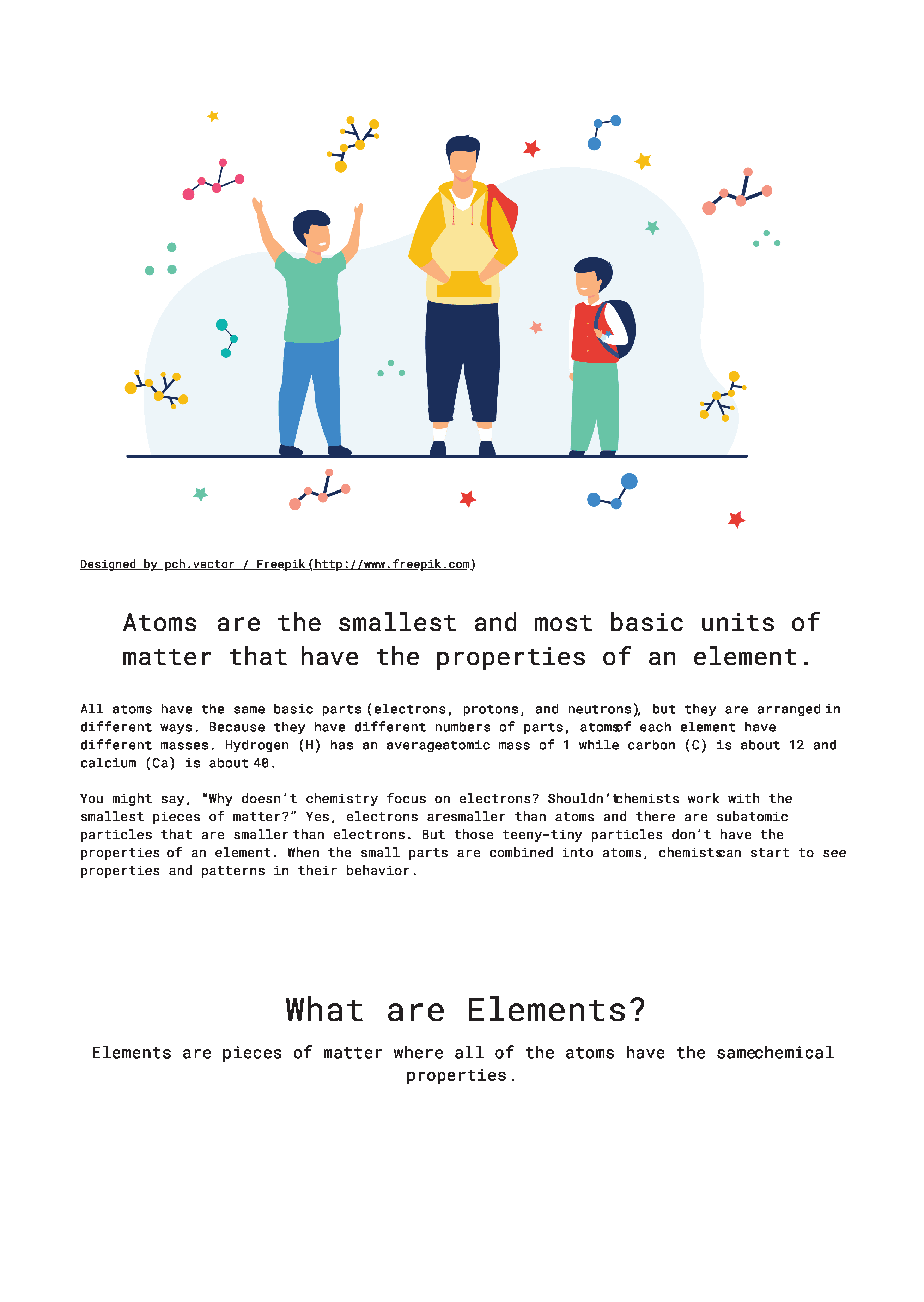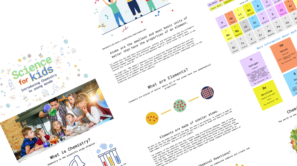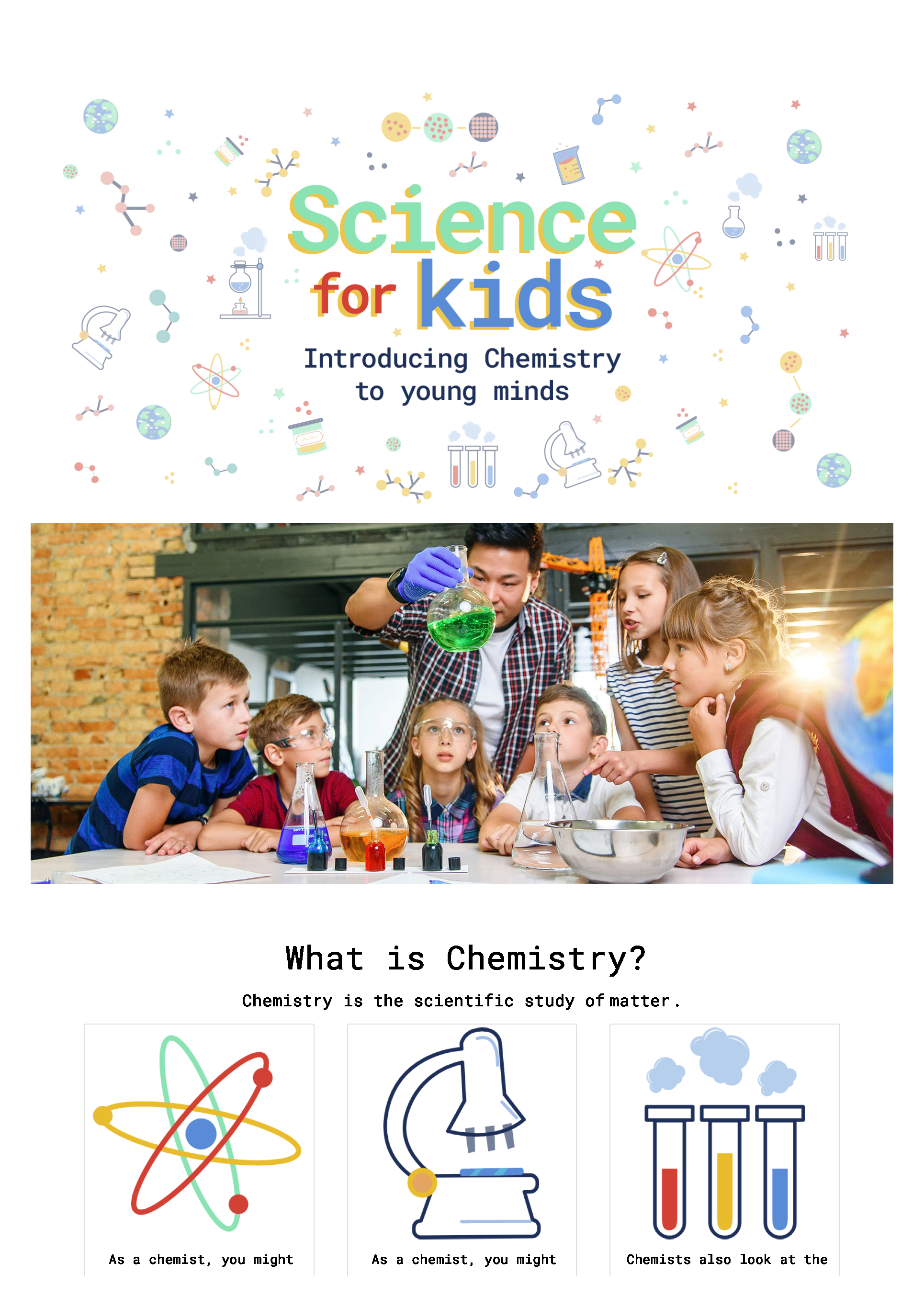 - Features kid-friendly images where basic information about Chemistry is introduced. Here are the topics used: