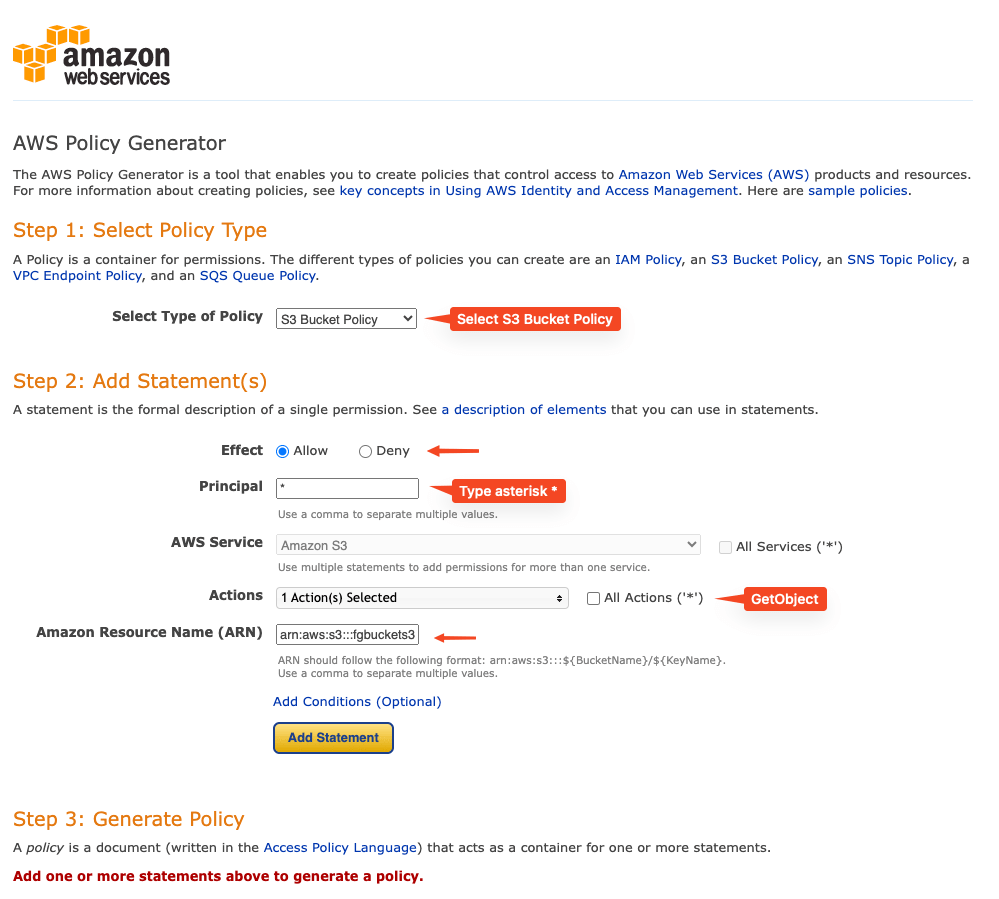 editand create a policy statement usingPolicy generator - Settings under Policy Generator